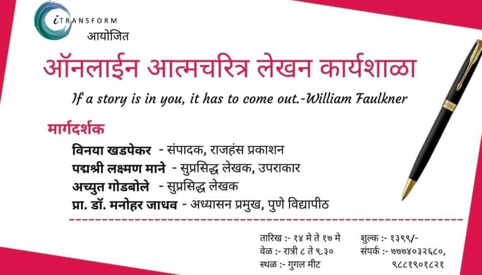 झालेलं नव्हतं. iTRANSFORM व बोलतो मराठी यांच्या वतीने दिनांक १४ मे ते १७ मे या कालावधीत आत्मचरित्र लेखन ऑनलाइन कार्यशाळा