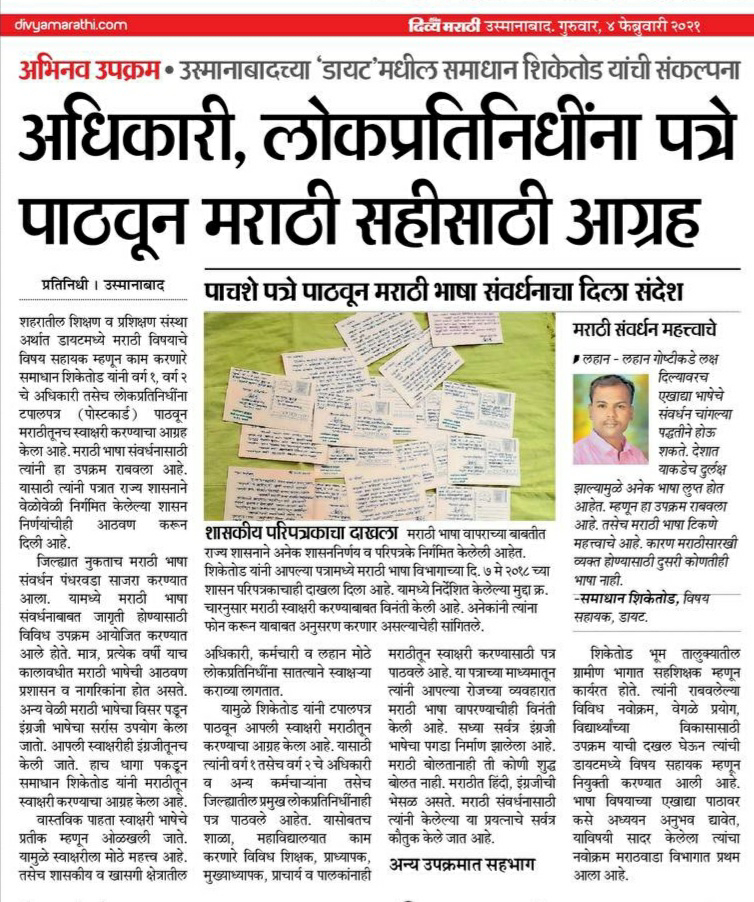 माझी सही मराठी सहीBy Samadhan Shiketod / February 10, 2021 मराठी भाषेतून स्वतःची सही करावी. मराठी भाषा संवर्धन पंधरवड्यानिमित्त पत्रलेखन उपक्रम राबवण्यात आला.